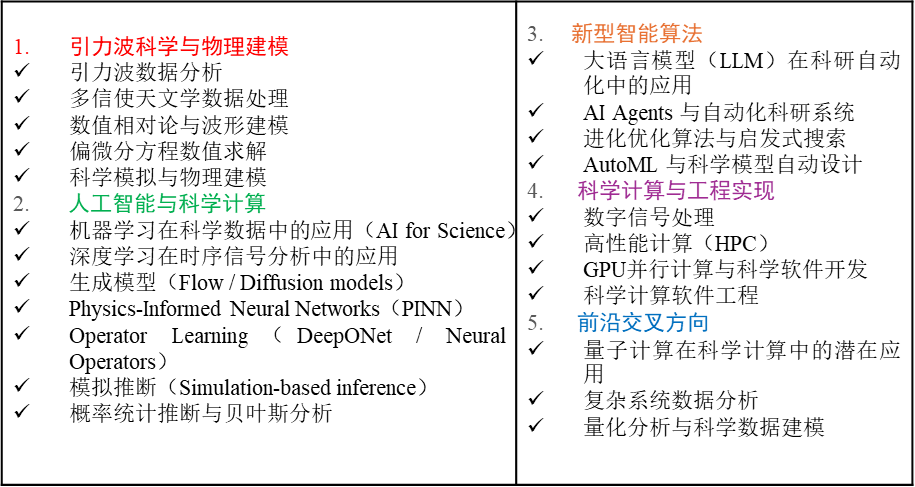 本项目围绕 引力波科学与AI for Science交叉研究,可能涉及的研究方向包括(但不限于):